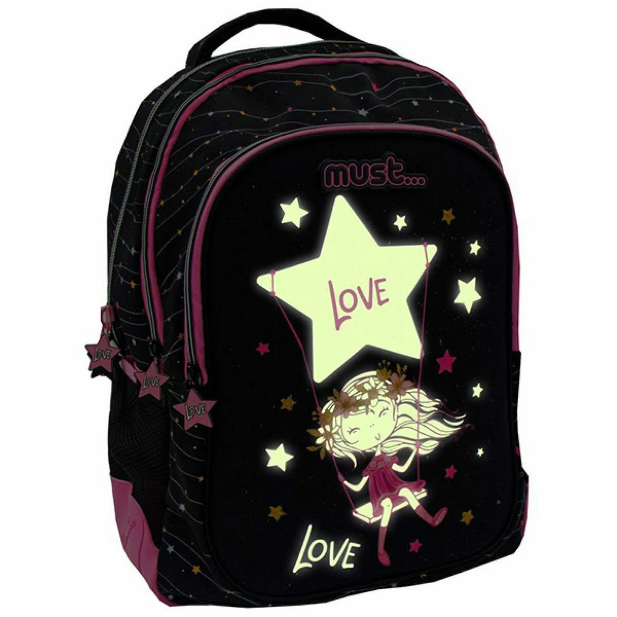 Διακάκης Σάκος Must Glow In The Dark 32X18X43 3 Θήκες Star Love Σχολική τσάντα η οποία μπορεί να φορεθεί στην πλάτη, κατάλληλη για παιδιά δημοτικού της εταιρίας Must σε μαύρο χρώμα.