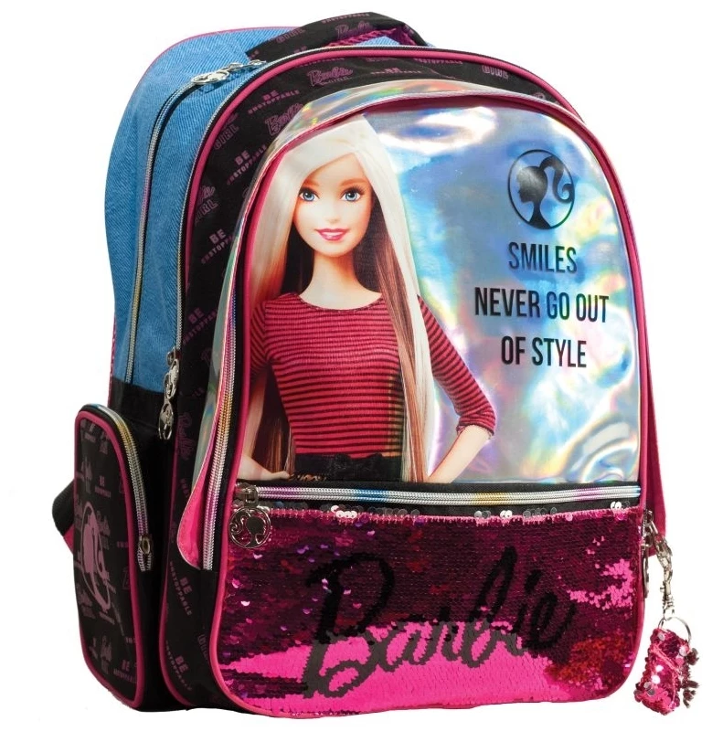 Gim Σάκος Barbie Denim Fashion •Δύο κεντρικές θέσεις και μία επιπλέον μπροστινή •Ανατομική πλάτη •Πλαϊνές θήκες για παγούρια •Ενισχυμένοι ιμάντες πλάτης •Ενισχυμένη λαβή χειρός