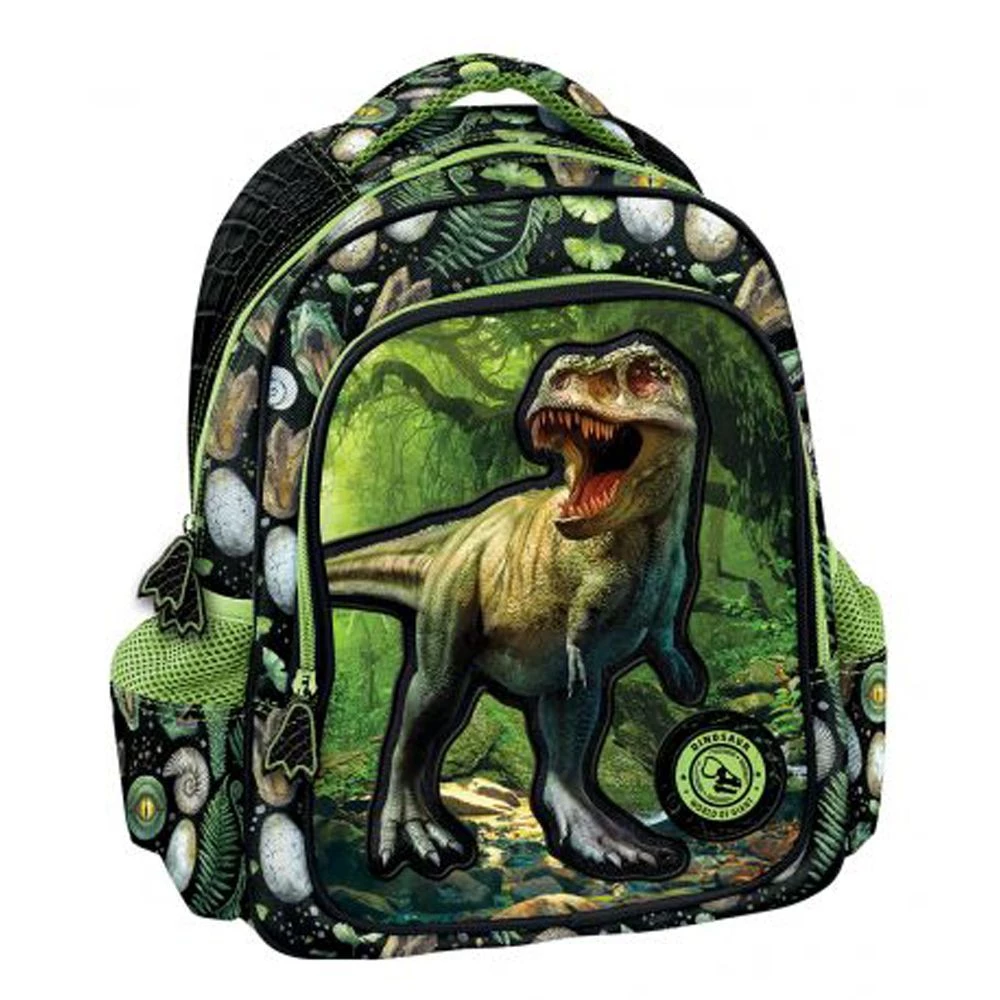 Σχολική τσάντα η οποία μπορεί να φορεθεί στην πλάτη, κατάλληλη για παιδιά νηπιαγωγείου της εταιρίας Graffiti με ανατομική πλάτη και θέμα Δεινόσαυροι σε πράσινο χρώμα.
