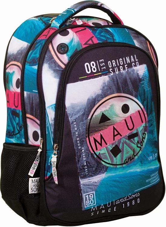 Maui and Sons σάκος Tropical •Δύο κεντρικές θέσεις και μία επιπλέον μπροστινή •Ανατομική πλάτη •Πλαϊνές θήκες για παγούρια •Ενισχυμένοι ιμάντες πλάτης •Ενισχυμένη λαβή χειρός •Επένδυση με τυπωμένη φόδρα •Δίοδος για ακουστικά