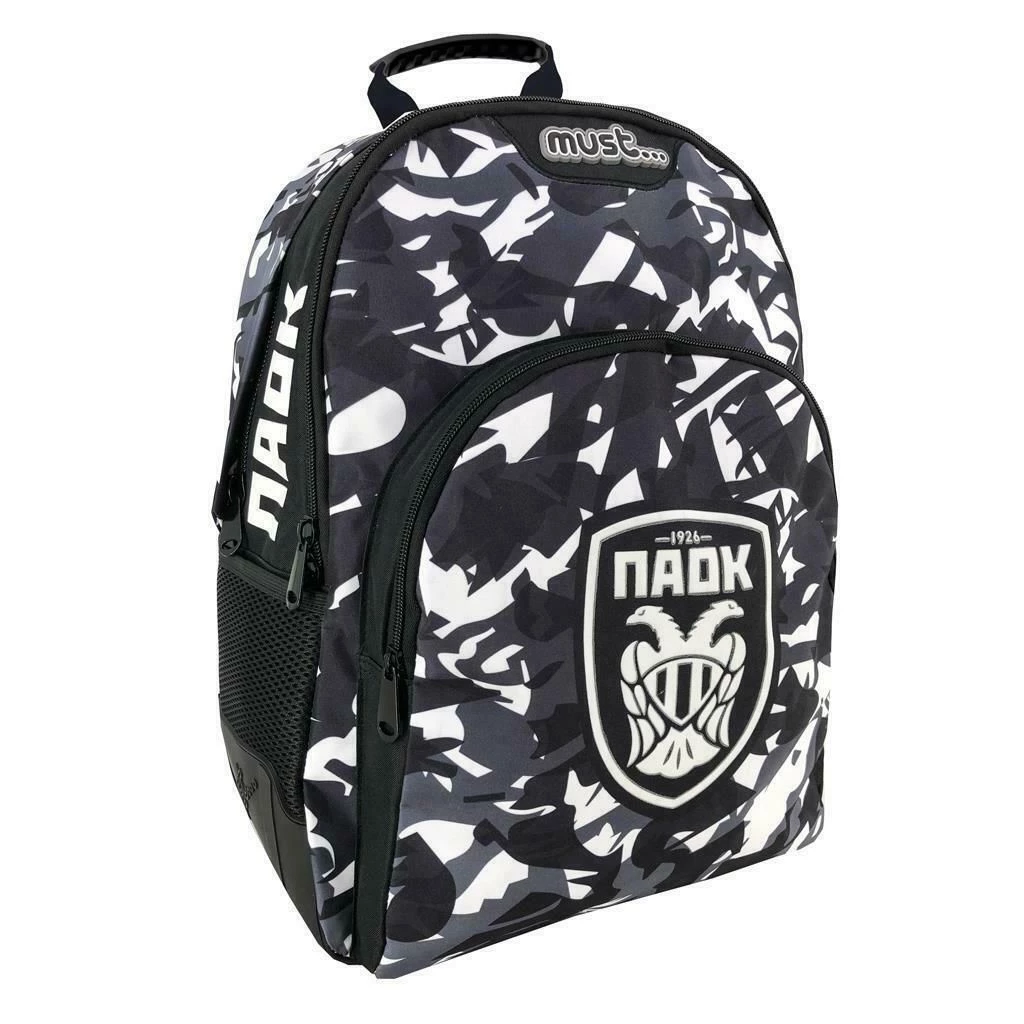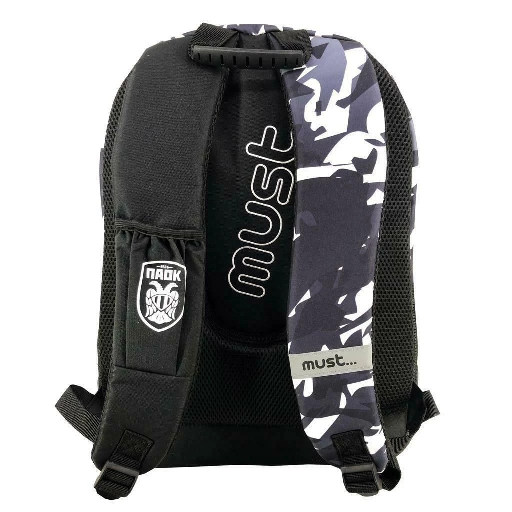 Διακάκης Σάκος 33Χ16Χ45 3 Θήκες ΠΑΟΚ Σχολική τσάντα η οποία μπορεί να φορεθεί στην πλάτη, κατάλληλη για παιδιά δημοτικού της εταιρίας Must με θέμα Ποδόσφαιρο σε μαύρο χρώμα.